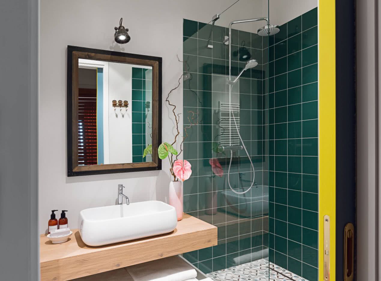 Если в ванной комнате нет кабины или душ находится за стеной, высота плитки может быть определена раковиной. Такие плитки будут своего рода высокими панелями, достигая почти 120 см. Если цвет материала и стен над ним контрастный, стоит знать, что горизонтальное деление поверхности, опускающееся чуть ниже половины высоты, визуально поднимет интерьер, а чуть выше понизит его.