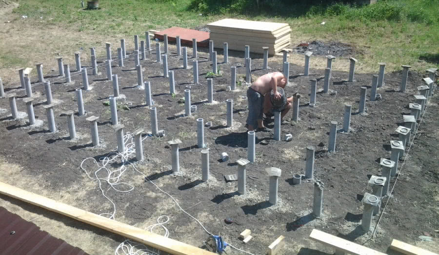 Дешевый в строительстве метод, не предполагает использование винтовых свай. А если взять армированные столбы с пластиковыми трубами, то фундамент легко заливается двумя людьми без дополнительных затрат на трудовые ресурсы. Единственное, что стоит учесть – необходимость в приобретении бетономешалки. Но дешевле станет аренда спецоборудования, что сегодня возможно через специализированные сайты.