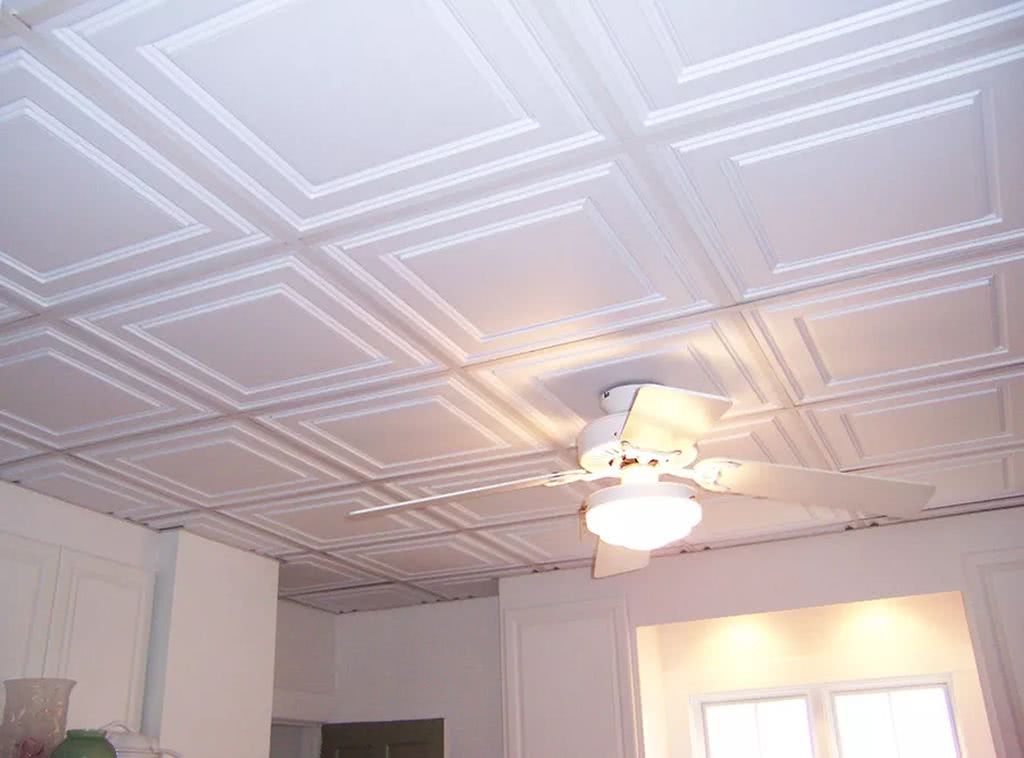 Плитка из пенополистирола. Рельефная поверхность с рисунком придает декоративный вид потолку, подходит любому интерьеру – от минимализма до классики. Плитка лёгкая, выпускается в разных формах, цветах, ее можно перекрашивать в любой оттенок. Подходит для невысоких помещений.