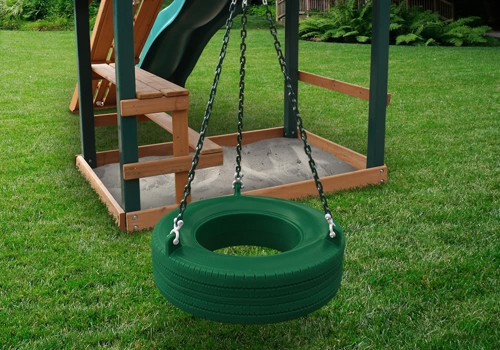 Люльку для качелей можно сделать из покрышки грузового автомобиля. Нужно всего лишь разрезать шину на две равные половинки, просверлить по краям отверстия под заделку канатов и подвесить люльку на перекладине. Жесткости сидения хватает, чтобы маленькому ребенку забраться внутрь целиком с ногами.