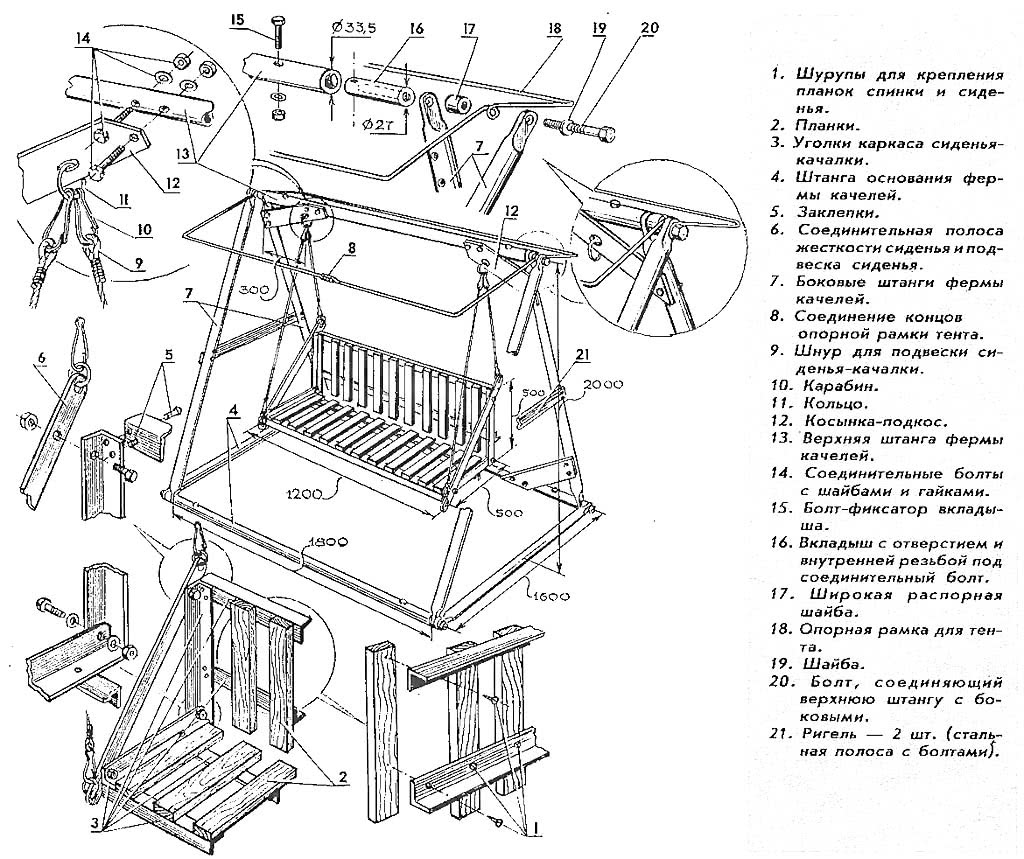 Это, пожалуй, самый интересный и удобный вариант качели для украшения приусадебного участка, но тем не менее, сложный в изготовлении. Рассмотри алгоритм действий подробно.