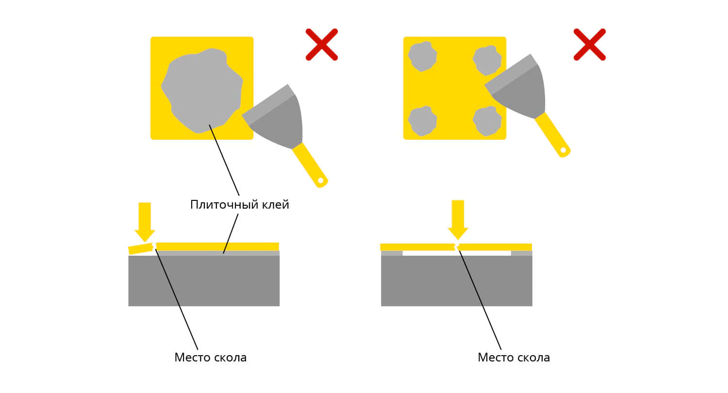 Это приведет к образованию пустот и последующему отклеиванию кафеля. Также движения гребенки не должны идти по дуге, лучше делать их горизонтальными или вертикальными. Подробнее про другие ошибки при кладке плитки читайте в отдельной статье.
