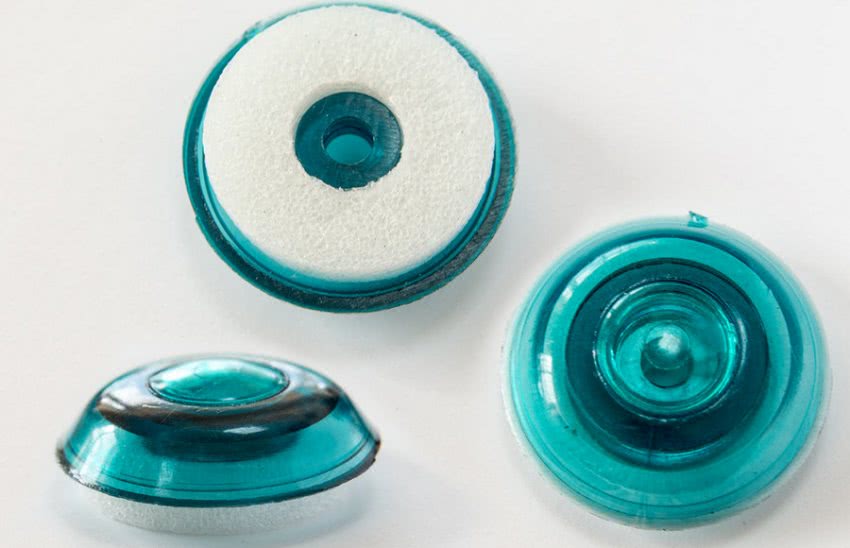 - пластиковой выпуклой шайбы с широкой ножкой, которая утапливается в отверстие в поликарбонате;