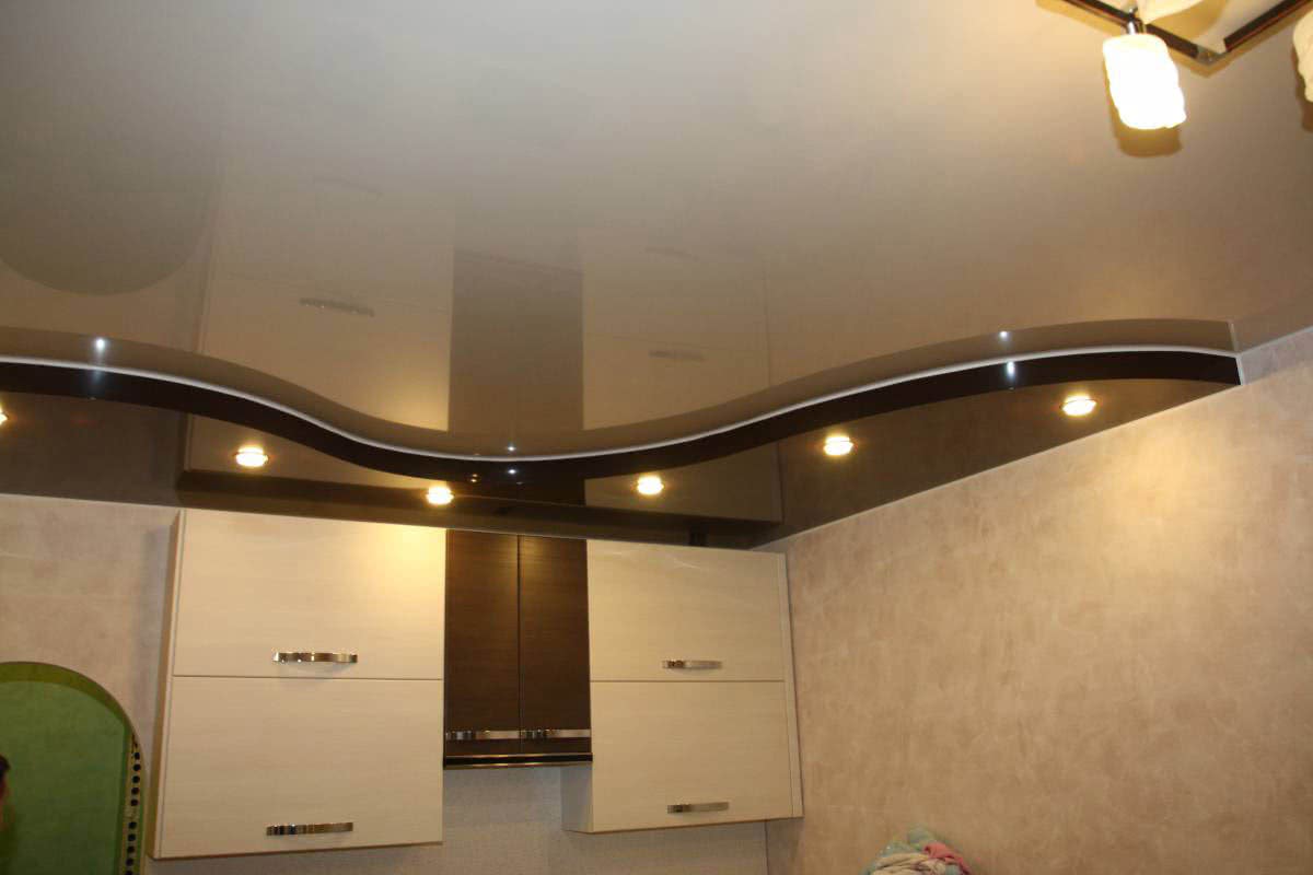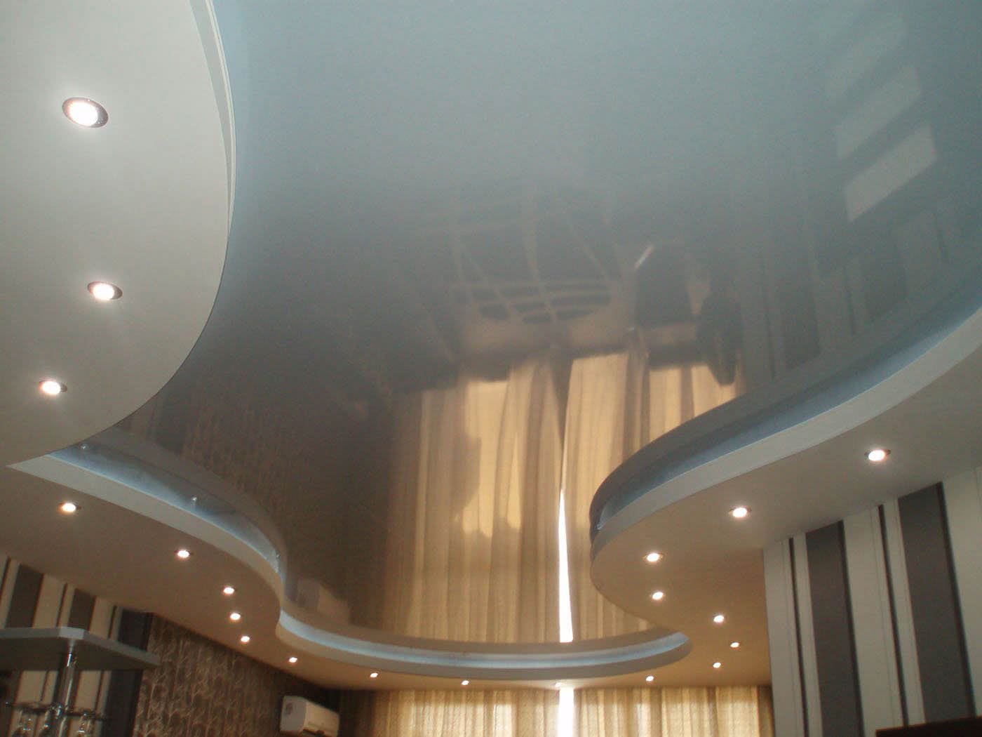 С технической точки зрения – это наиболее сложная модель для реализации. Т.к. помимо крепления самого натяжного потолка, включает в себя изготовления короба из гипсокартона. Однако такие конструкции обладают одним существенным достоинством – они могут быть какой угодно формы, поэтому нет никаких ограничений в декорировании потолка.