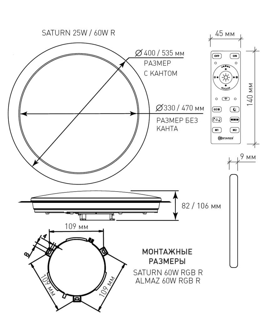 Светодиодный светильник Saturn с пультом представлен в двух мощностях 60W (SATURN 60W R-470-SHINY/WHITE-220-IP44 и SATURN 60W RGB R-470-SHINY/WHITE-220-IP44) и 25W (SATURN 25W R-328-SHINY/WHITE-220-IP44 и SATURN 25W RGB R-328-SHINY/WHITE-220-IP44) относится к серии Astrella торговой марки Estares производитель MAYSUN Enterprise LTD , Китай. На сегодняшний день является заменой классической люстры. Многие называют данный светильник как люстра Сатурн.