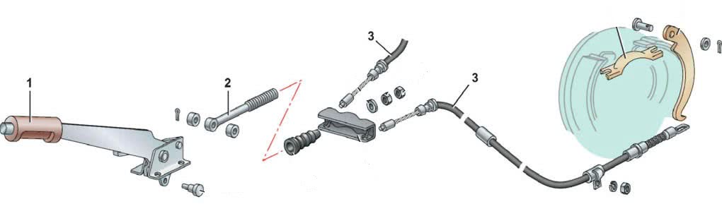 - Концы троса (или двух тросов), установленные на коромысле, крепятся к рычагам тормозных механизмов задних колес – дисковых или барабанных.