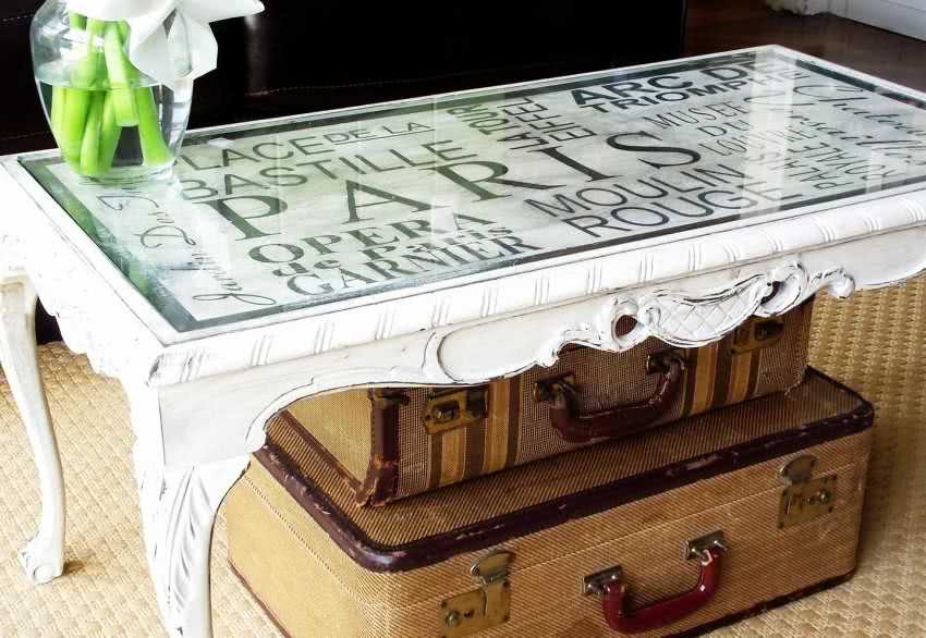 Старый журнальный столик, следуя технологии о которой пишется выше, легко превратить в красивое дополнение к современному интерьеру. Оклейте его обычной обёрточной бумагой и нанесите несколько слоёв лака. Плотная бумага не размокает от лака и прекрасно приклеивается.