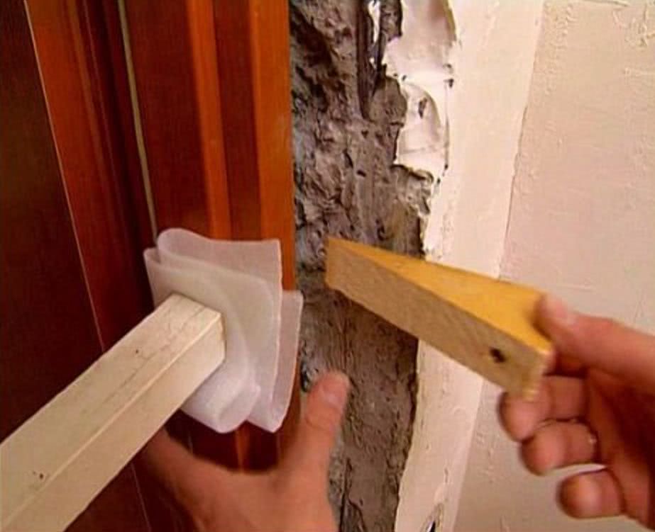 Дверную коробку ставят еще до начала работ по отделке откосов. Так конструкция будет более прочной, и не потребуется заполнять щели между стеной и откосами. При установке обязательно с помощью уровня проверяют, чтобы коробка стояла максимально ровно по вертикали и горизонтали. При необходимости применяют деревянные клинья для регулировки.