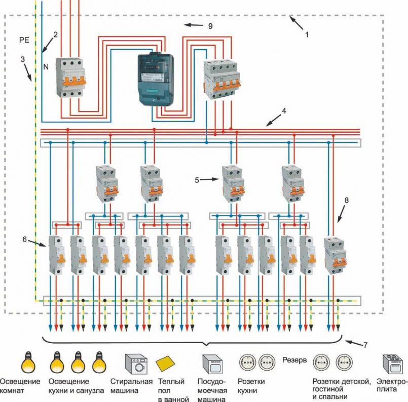 В схеме указаны два групповых автомата с нагрузками 1 и 2, например, 1 – розетки, 2 – освещение. На самом деле их может быть больше, в зависимости от количества электрических приемников и их мест расположения в помещении.