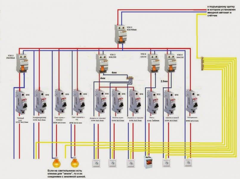 При таком варианте схемы установка УЗО производится после вводного автоматического выключателя и ещё на каждую отходящую линию.