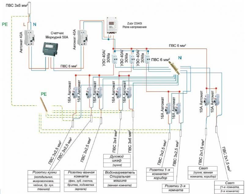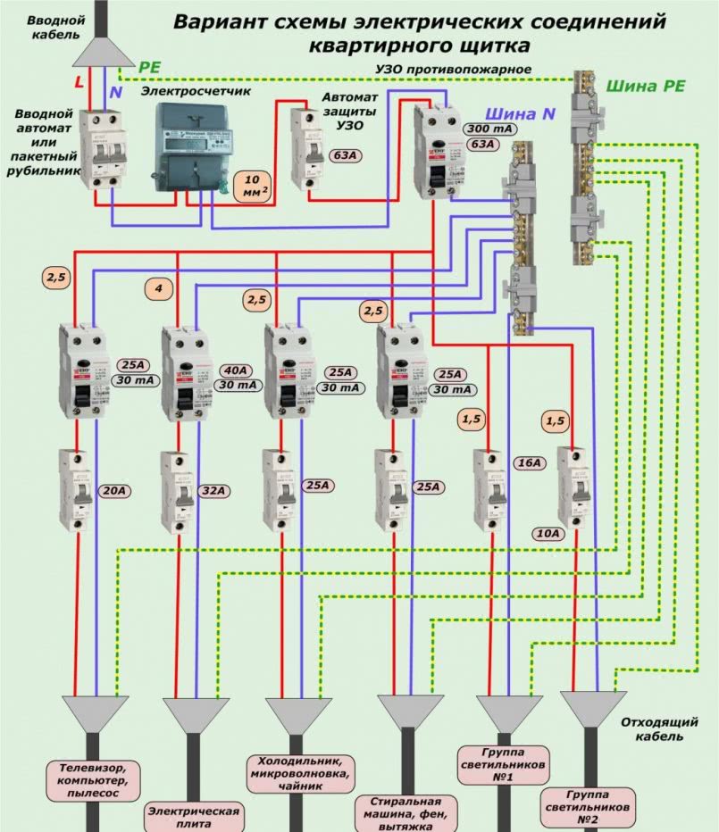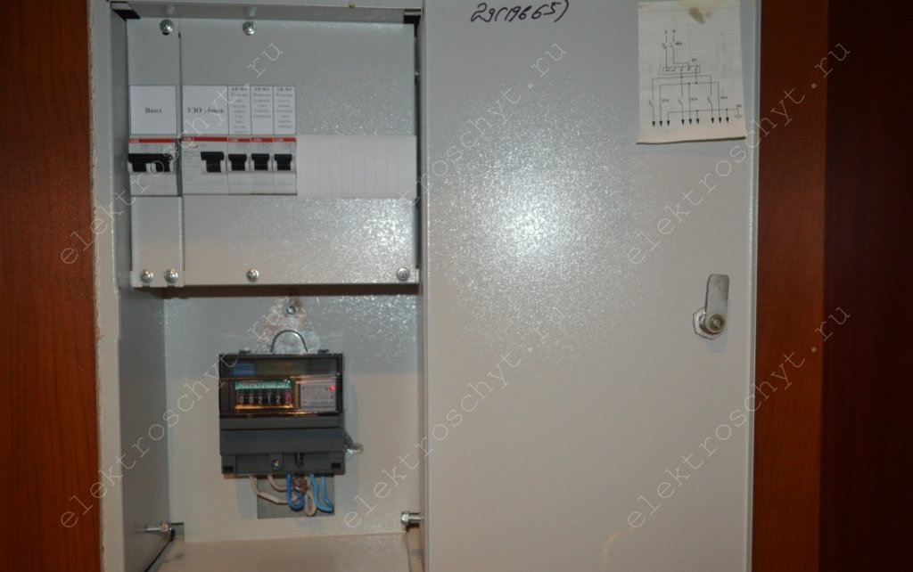 Имейте в виду, что широкое распространение получила ещё одна разновидность такой схемы, в ней между вводным автоматом и УЗО принято устанавливать счётчик электрической энергии.