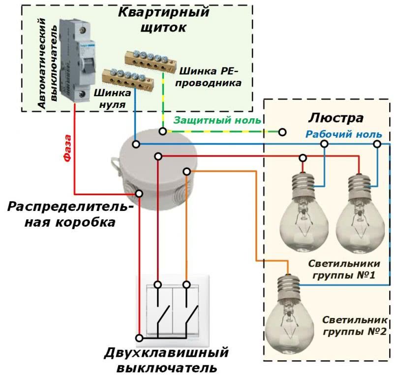 Само подключение не должно вызывать сложностей. К первому светильнику от выключателя проводится фаза, далее от первого переключателя кабель протягивается к следующему устройству. К последнему светильнику прокладывается ноль, который идет от распределительной коробки.