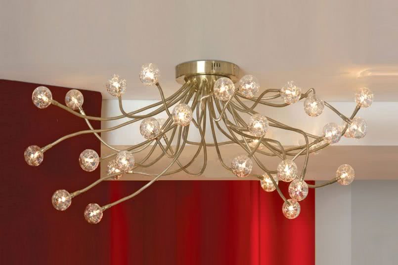 По своей природе лучевая схема относится к параллельному подключению, часто применяется для люстр. Принцип реализации заключается в прокладке кабеля к каждому осветительному прибору индивидуально. Этот способ самый трудоемкий и требует больших финансовых затрат из-за большого количества используемого провода. Для экономии кабель от распределительного щитка проводят в центр комнаты и уже оттуда к каждому светильнику. Далее к фазе и нулю подводят одножильные провода, которые прокладываются к светильникам.