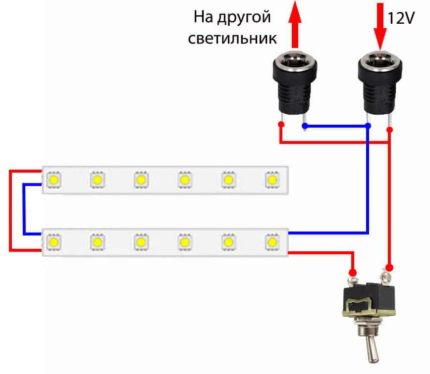 Для реализации нужно подключить фазу от одного светильника к другому, а к последнему подсоединить нулевой провод. Предварительно фаза подается на выключатель, что гарантирует его функциональность.