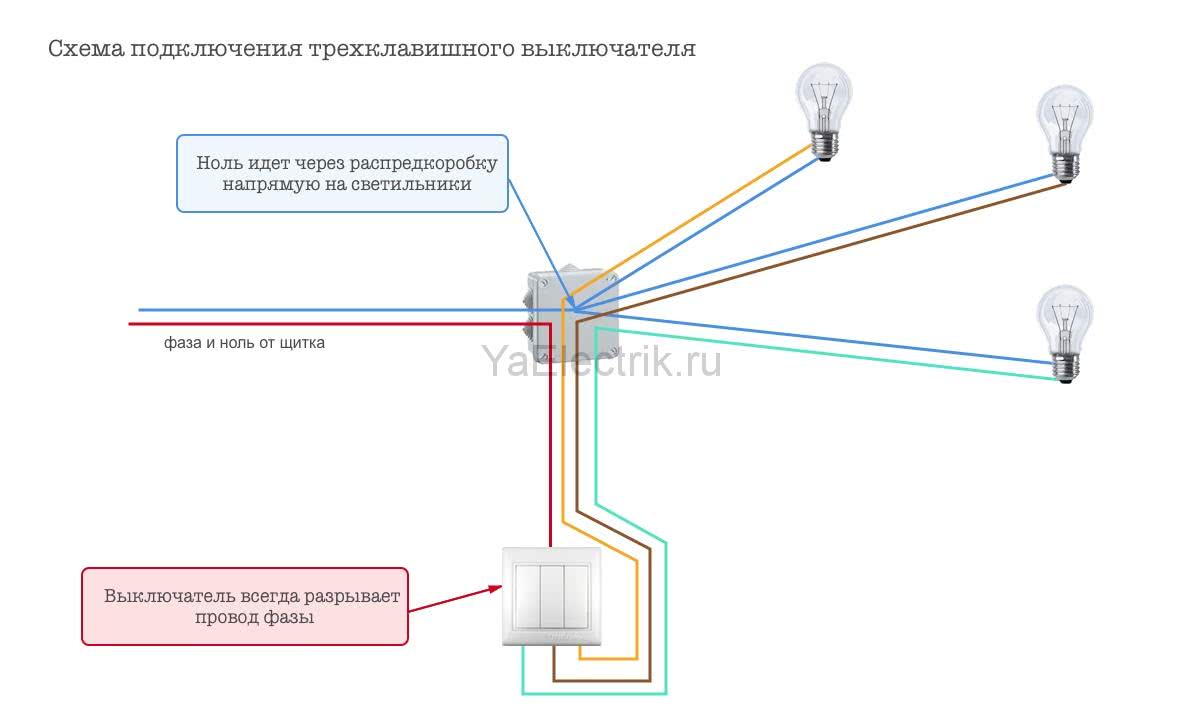 При грамотном подключении на выключатель от разветвительной коробки приходит фазный провод. Прерывать цепь фазного провода, чтобы в отключенном состоянии светильник находился без напряжения – основная задача выключателя.