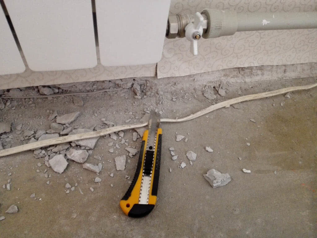 Отогнув края линолеума, обратить внимание на бетонное основание. В старых домах, а порой и в сданных новых жилых комплексах, на краях стяжки образованы наплывы цементного раствора – их необходимо сбить или счистить при помощи молотка и старой стамески, а затем подмести и пропылесосить