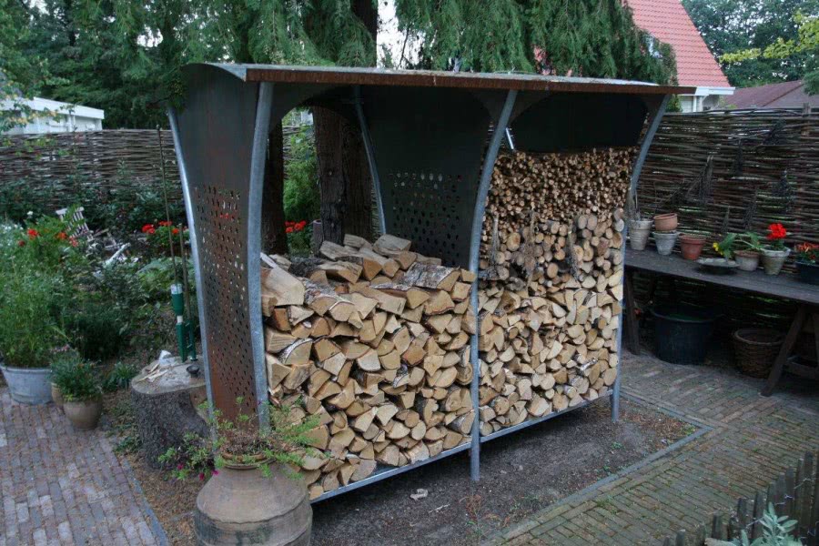 Если вы планируете использовать металл не только для опоры, но и для стен дровника, то можно задуматься о кованом дровнике