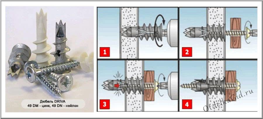 Крепить массивные предметы, создающие нагрузку до 25–30 кг на одно место фиксации, рекомендуется при помощи специального дюбеля – Driva. Его устройство аналогично предыдущему варианту, но пластиковый элемент имеет форму «улитки». Деталь снабжена острым наконечником и резьбой, расположенной на поверхности корпуса. Для фиксации используется специальный винт.