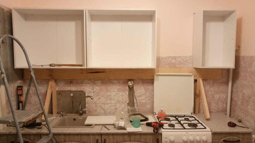 Первым делом нужно демонтировать фасадные дверцы, обрезать заднюю стенку и закрепить крючки. После этого нужно прислонить гарнитур к стене и наметить границы.