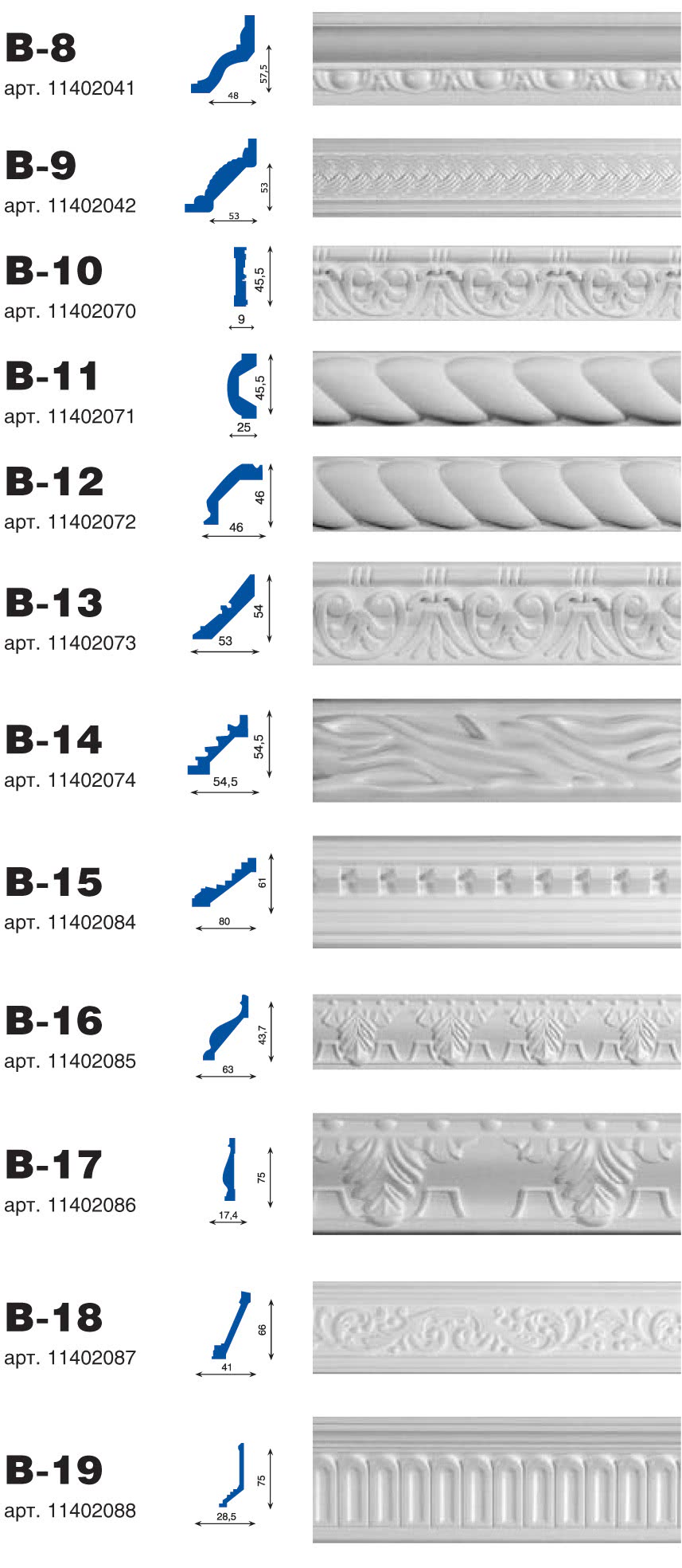 Краткий ассортиментный ряд потолочных плинтусов различной формы