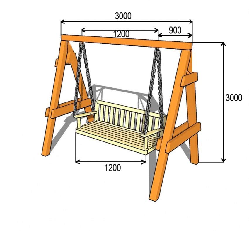 Рассмотрим процесс создания простейших качелей. В первую очередь надо определиться с планом работ и подготовить чертеж. Его можно сделать самостоятельно или найти готовые варианты в интернете. Второй вариант является предпочтительным, так как вы сможете увидеть не только чертежи, но и фото садовых качелей, сделанных по ним.