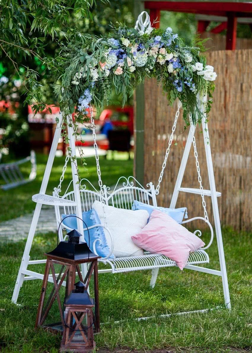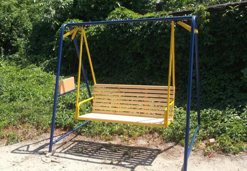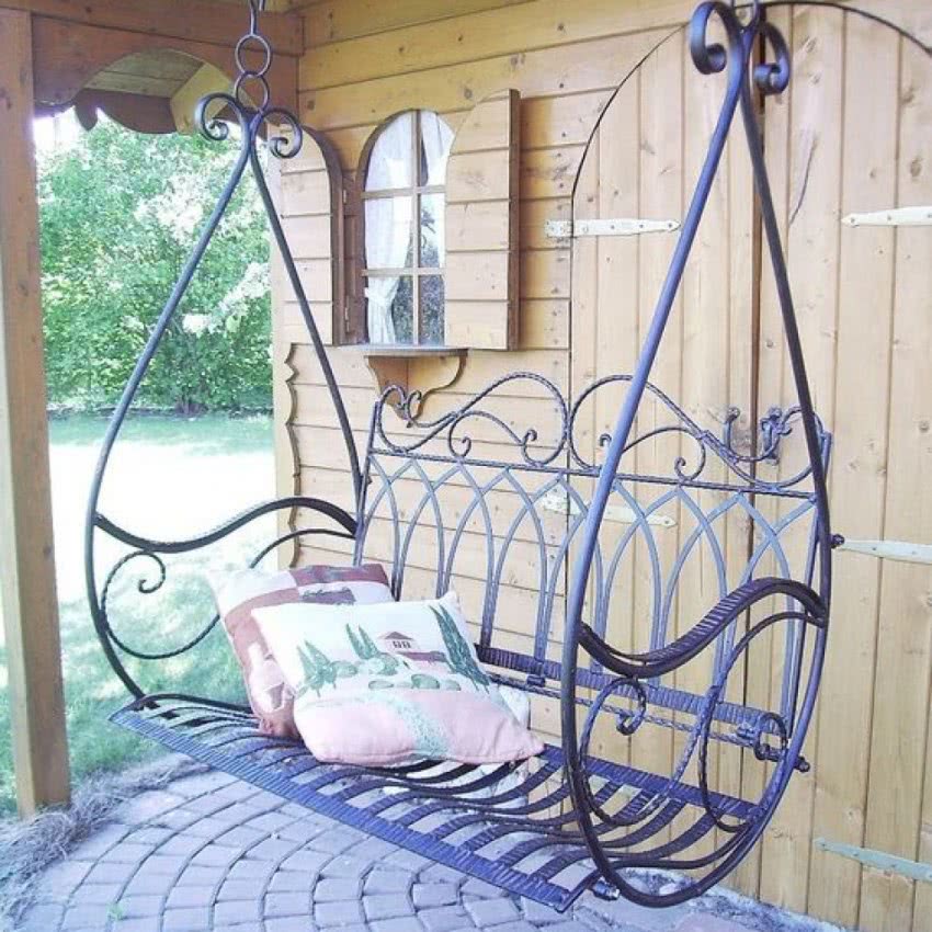 - сидение металлических качелей следует сделать из дерева или уложить сверху мягкие подушки со сменными чехлами, чтобы было комфортно качаться на них;