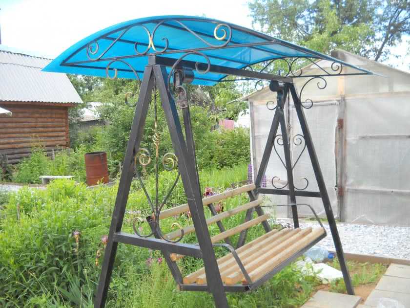 Полезно будет дополнить качели козырьком. Не только детям, но и взрослым очень важна эффективная защита от осадков и солнечных лучей. Козырек представляет собой прямоугольную стальную раму с усилением перемычками. Сверху на раме монтируют лист поликарбоната.