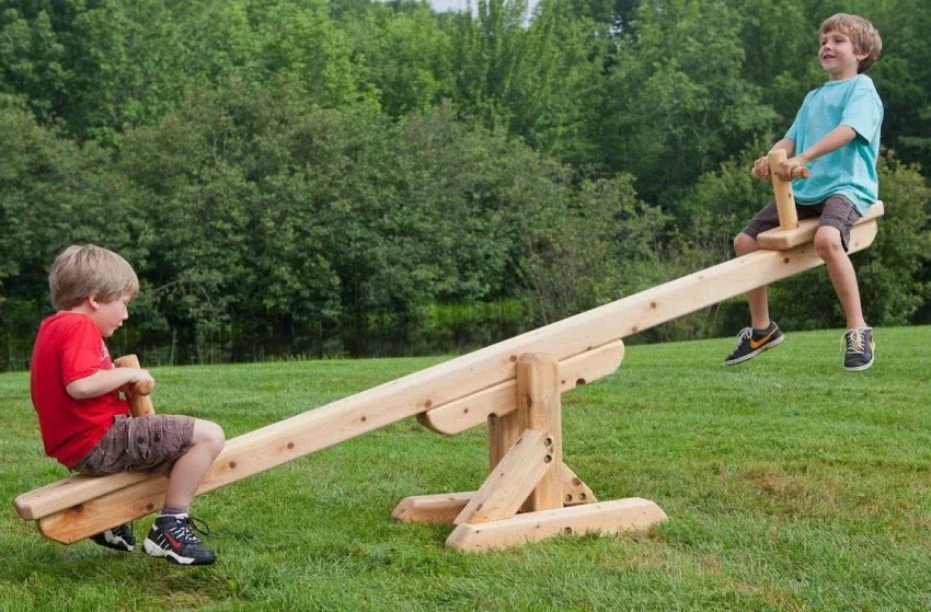 - Одна ось. Наиболее простая сборка, легкая даже для детей, качающаяся только вперед-назад. Но, если школьники орудуют веревкой и крепкой веткой, то взрослый сможет сварить железного зверя. Данные качели можно обезопасить специально спинкой и отделениями для маленьких детских ножек.