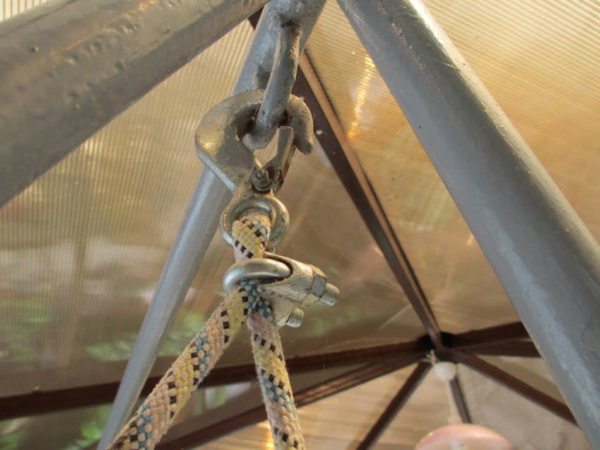 До завершения сборки все дерево пропитывают антисептиком и лаком. Металлические части надо грунтовать и красить. По углам каркаса ставятся рым-болты. Для прикрепления цепей на ушки подобных болтов применяются либо нарезные муфты, либо монтажные карабины. Подвешивать скамейки нужно также на рым-болты. У домашних мастеров есть выбор, закреплять ли их на углах или поверх краев.