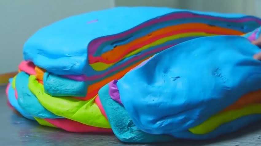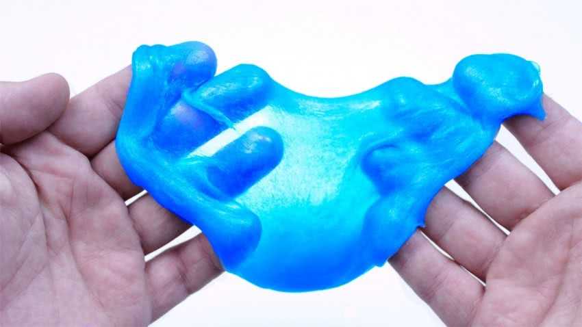 Этот слайм после завершения работы получается мягким, растекающимся, но не липким. Необходимо взять 100 мл канцелярского клея любой марки, а также 100 мл холодной воды. Клей выложить в емкость, залить водой. После лопаткой или ложкой сделать из клея комок, как бы сбивая его в единое целое. Дальше сгусток достать, продолжить мять его руками (можно положить в целлофановый пакет).