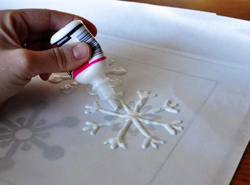 - Если бутылочка клея с носиком, то на файле обводят контуры заготовленной снежинки. Если носика нет, то прибегают к помощи шприца, проделывая то же самое.