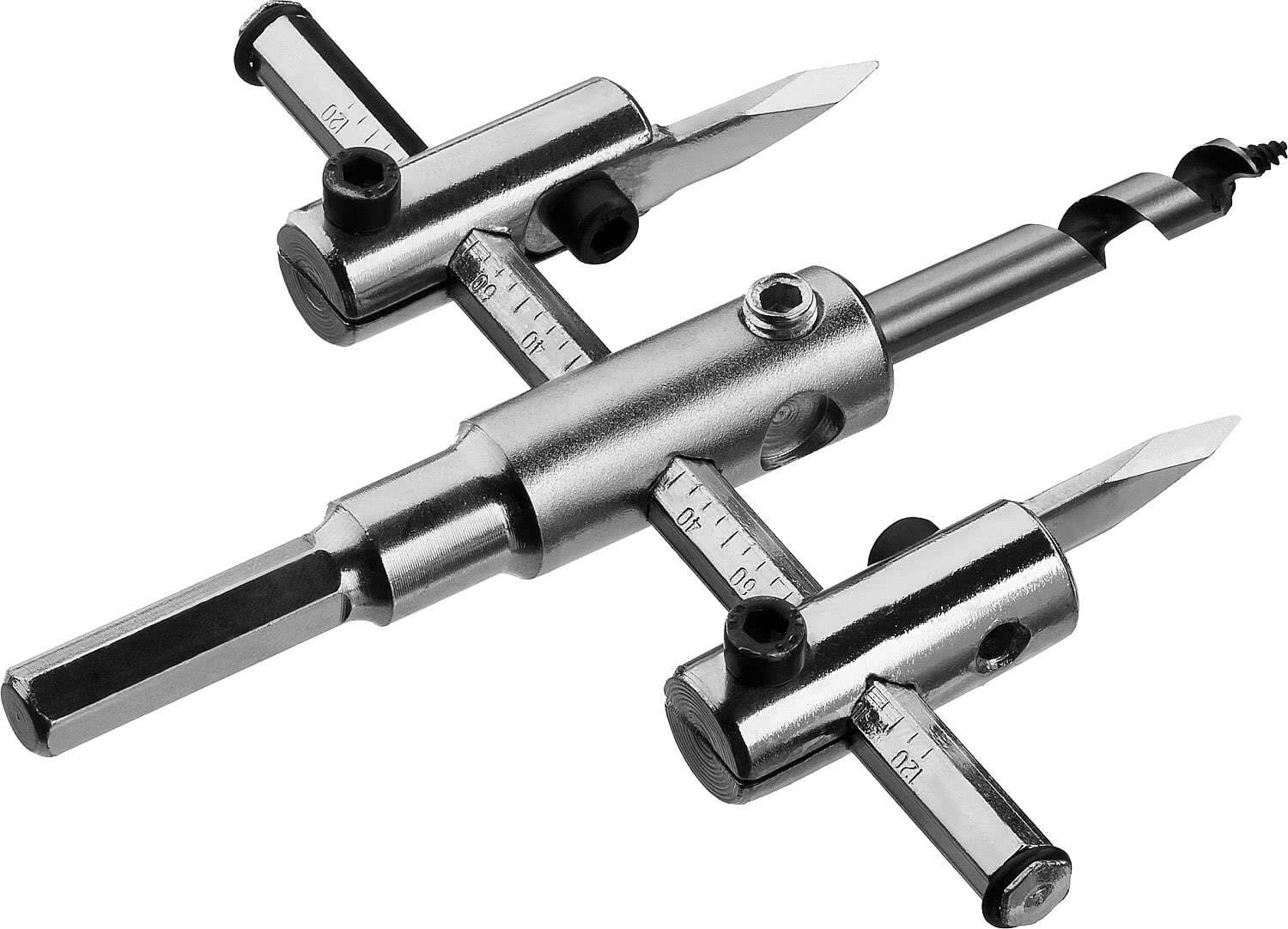 Благодаря возможности перемещения резца по штанге инструмент можно настроить на вырезку отверстия необходимого диаметра в пределах длины штанги. Это избавляет от необходимости покупать коронки разного диаметра.