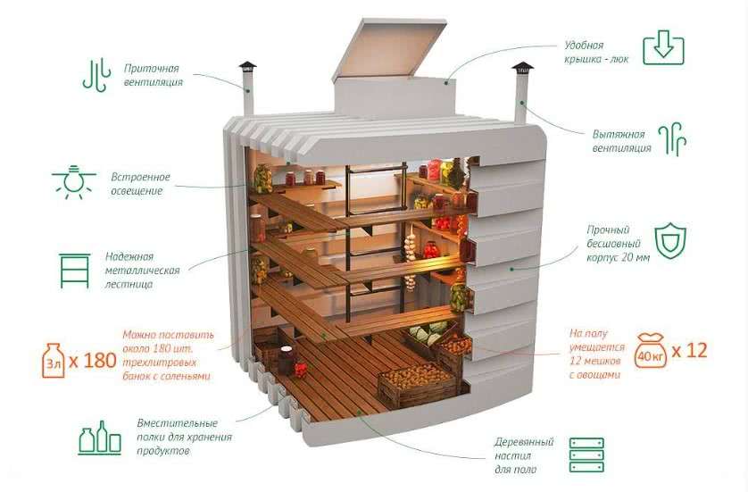 - Внутри подземного хранилища можно разместить большое количество продуктов, не сравнимое с тем, что помещается в холодильниках.