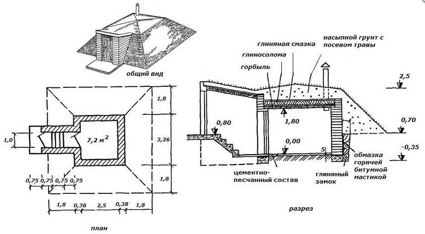 - Необходимую теплоизоляцию обеспечивает многослойное утепление глиной, пенополистиролом, керамзитом и слоем земли толщиной 0,7-1,2 м.