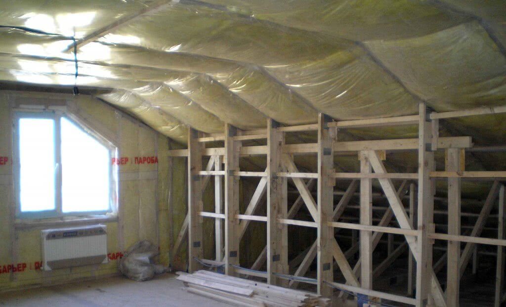 Перед укладкой теплоизолятора все получившиеся «короба» укрывают пароизоляционным материалом так, чтобы были закрыты и балки перекрытия. При этом полотна пленки (мембраны) настилают внахлест 10-15 см.