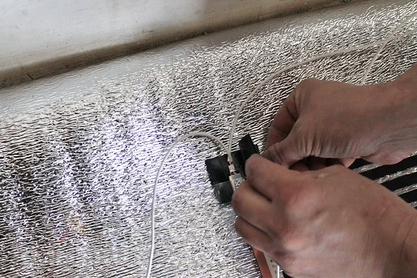После того как монтаж был завершен, провода, идущие от инфракрасных пленок, следует подключить к терморегулятору, равно как и датчик температуры. После окончательной проверки правильности подключения можно подать напряжение и протестировать работу теплого пола.
