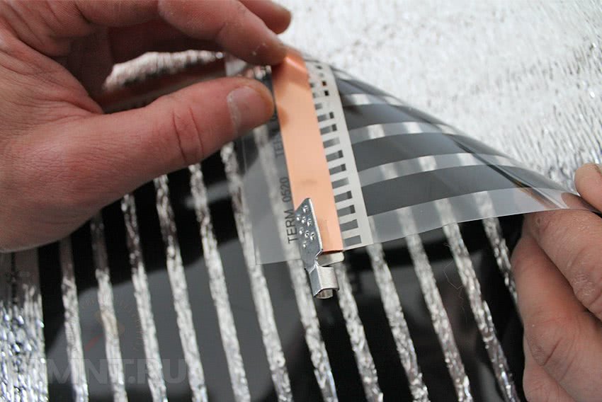 Со стороны монтажа (обычно ближе к месту установки терморегулятора) крепим к медным полосам нагревательной пленки наконечники для подключения питающего провода, вставляем в них провод и крепко зажимаем его в наконечнике плоскогубцами.