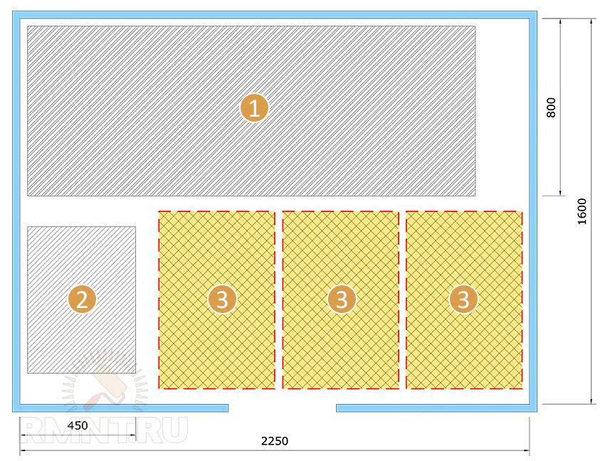 Из рисунка становится понятно, что для организации теплого пола нужны три полосы пленки длиной около 650–700 мм каждая. Исходя из этого, приобретаем 2 метра инфракрасной пленки шириной 500 мм.