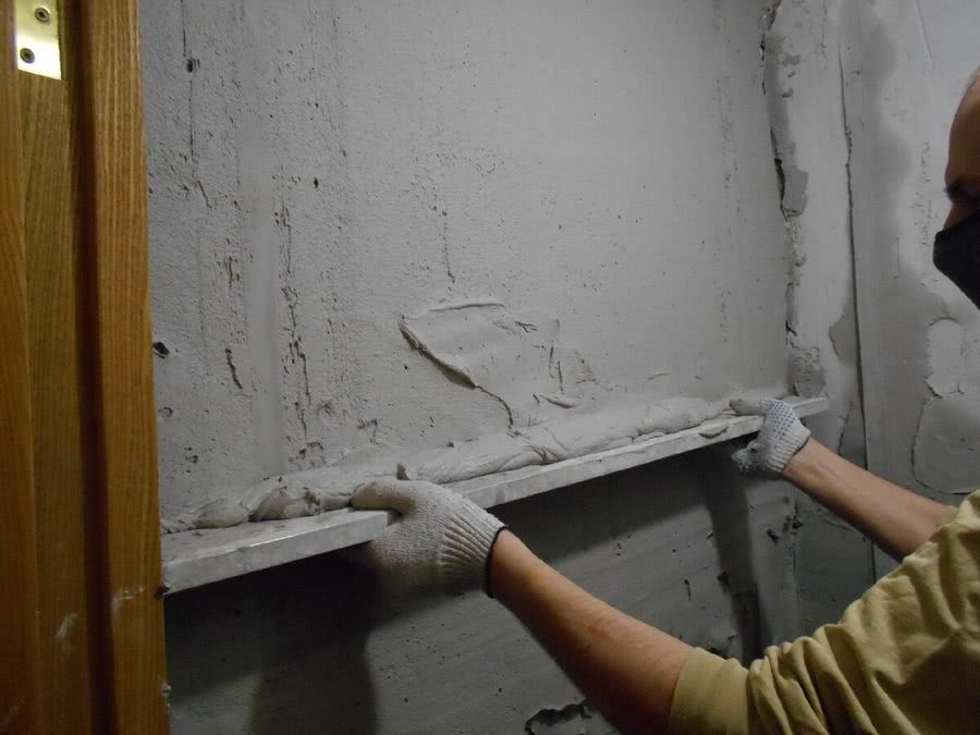 Работу начинают после удаления старой осыпающейся штукатурки и очистке стен от пыли: