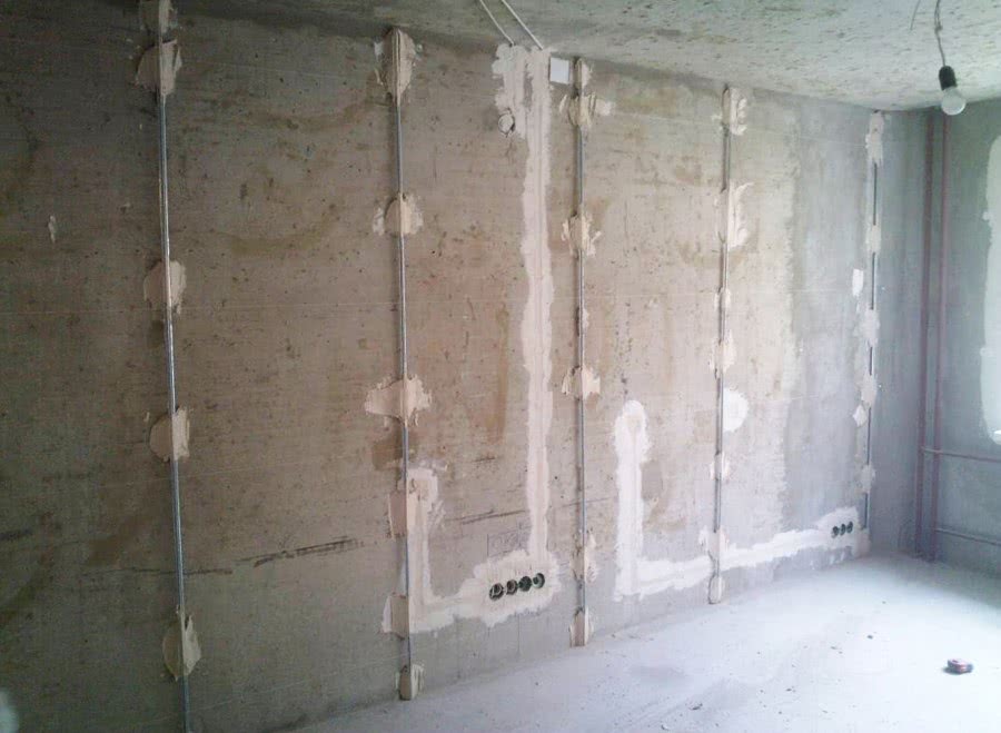 Прежде чем приступать к работе, необходимо полностью отключить в квартире электричество. После поверхность тщательно очищается от старых обоев, штукатурки или краски. Затем обработайте поверхность грунтовкой. В таком случае строительная смесь лучше закрепится. Грунтовка увеличивает влагоустойчивость и предотвращает расслаивание материалов. Для цементных смесей используется раствор цемента, воды и песка. Чтобы стена получилась максимально ровной, на ней необходимо закрепить маячки. Для этого по бокам стены устанавливаются профили. Вертикальность маячков проверяется отвесом.
