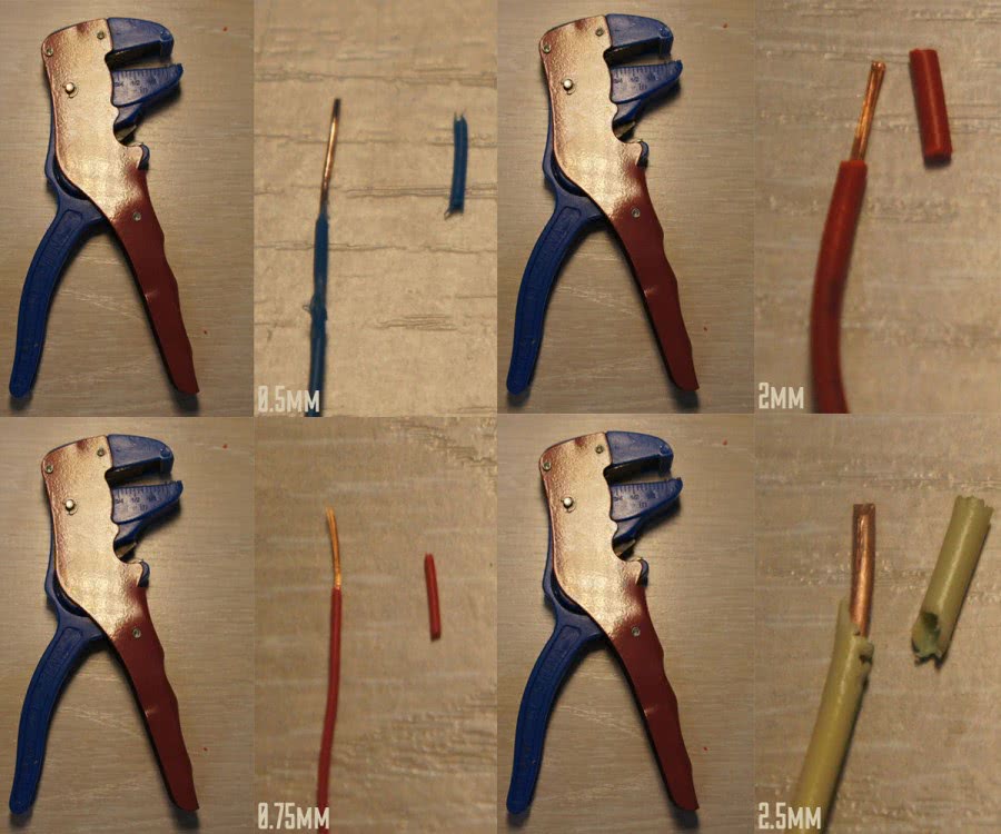 Используя отверстия разных диаметров (на прищепке) вы получаете универсальный инструмент для снятия как внешней оболочки, так и покрытия непосредственно на проводниках.