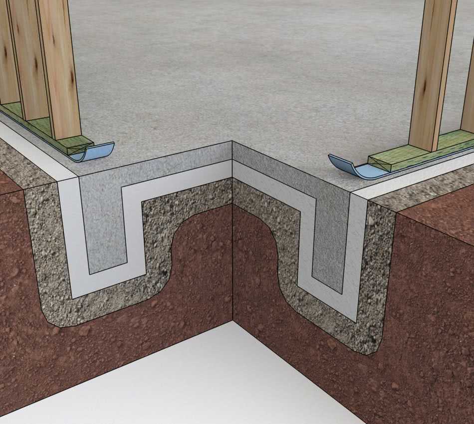 Чтобы построить ленточный фундамент, объединенный с монолитной плитой, без подвального помещения выполняют действия в следующей последовательности: