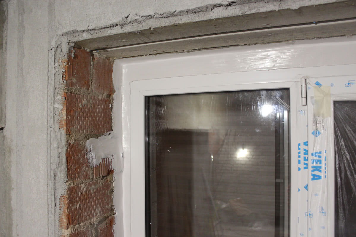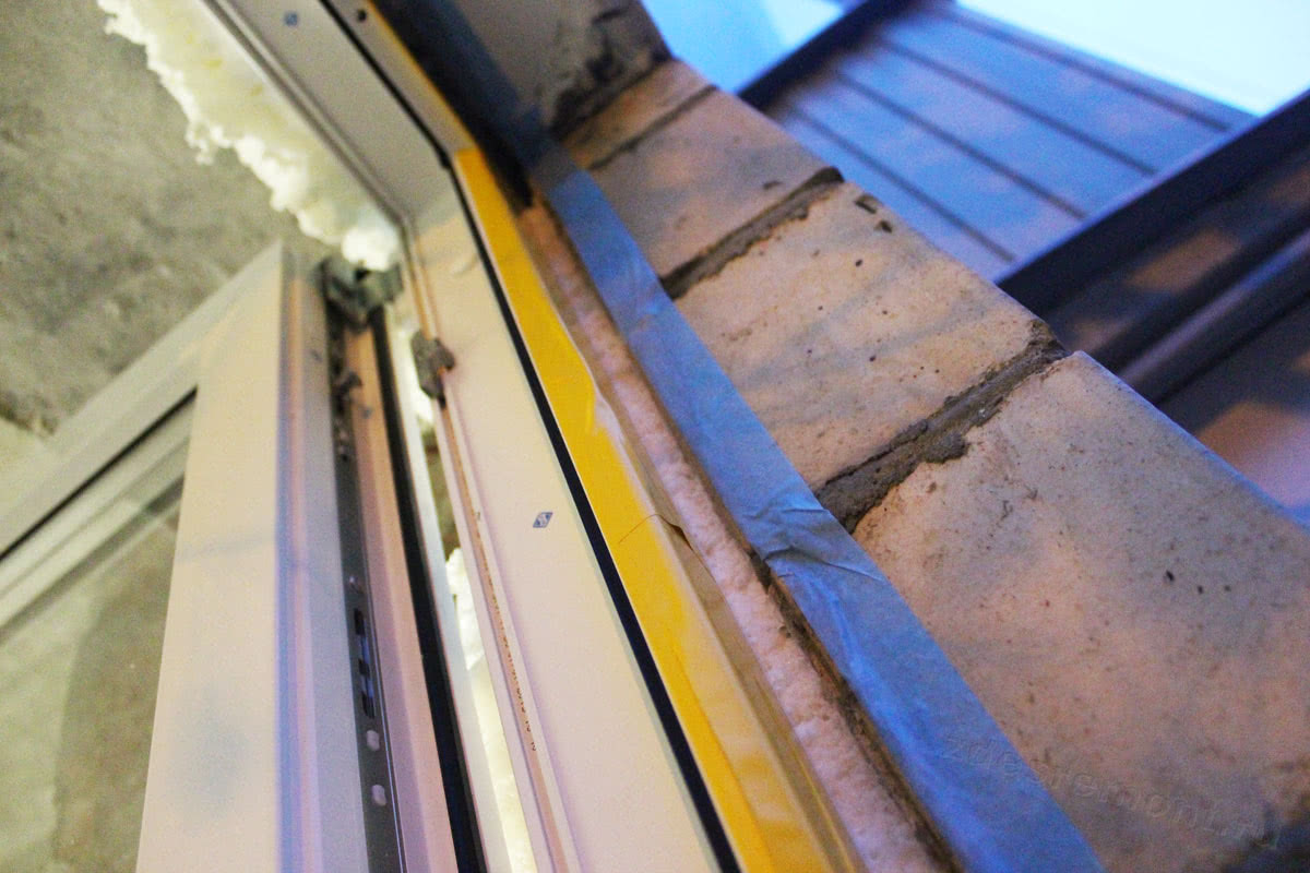Затем снаружи окна приклеил малярную ленту на оконную раму и на стену для создания границ и чтобы получить аккуратный и ровный шов. Внутри, в качестве ограничения на оконной раме, послужила заводская защитная пленка. На стену внутри клеить ничего было не нужно, так как далее все закроется откосами и подоконником.