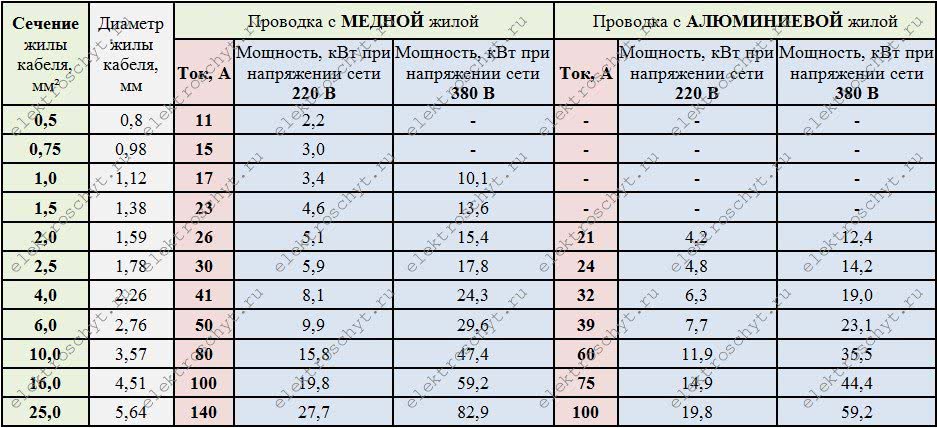 Чтобы выбрать сечение кабеля для дома или квартиры, по вышеуказанным таблицам, достаточно знать сумму мощностей электроприемников данной кабельной линии (группы). Расчет тока все равно нам будет нужен при проектировании электрощита (выбор автоматов, УЗО или диф.автоматов).