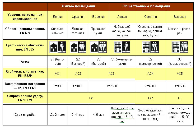 Весь ламинат подразделяется на 6 классов по износостойкости.