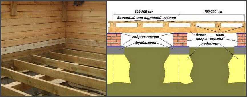 — при изготовлении опор для лаг можно использовать бетонные блоки, кирпич и другие подходящие материалы. Расстояние между опорами зависит от сечения лаг и обычно выбирается в пределах 1,0-1,5 м. На опоры укладывается гидроизоляция из нескольких слоев рубероида;
