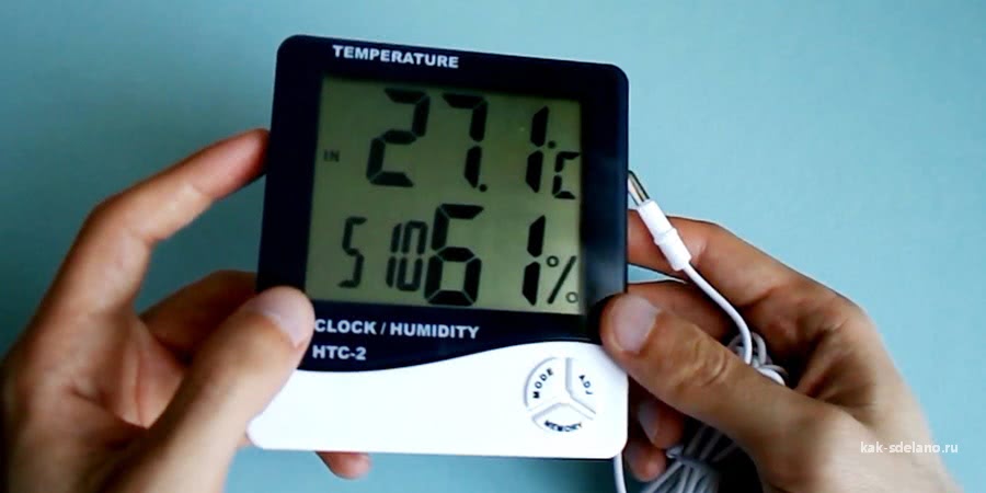 Влажность воздуха возможно померить благодаря термогигрометру. Рассмотрим его работу. Он обладает сложной системой, поэтому он определяет не только уровень влаги, но и значение температуры внутри комнатного помещения. Также дополнительно данный аппарат проводит фиксацию значений состояния влаги и температурной величины в различных точках. То есть он сравнивает состояние двух показателей в месте, где он находится на этот момент, и в предыдущем помещении.