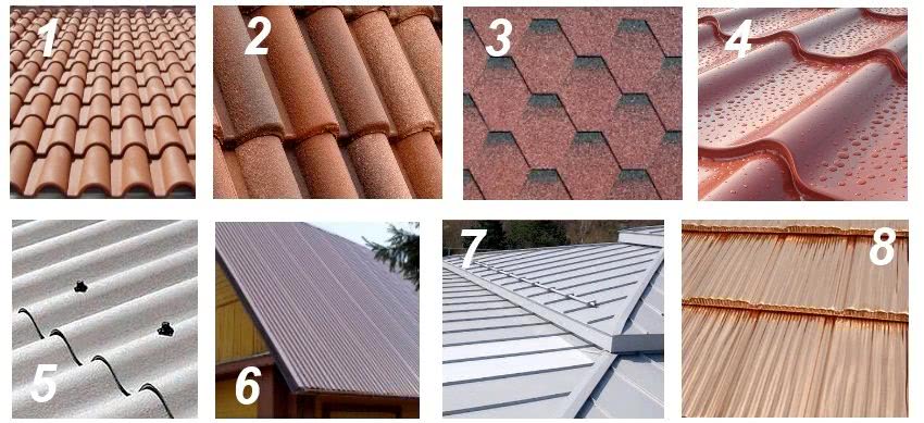 Различные виды кровли: 1 — керамическая черепица, 2 — песчаная черепица, 3 — мягкая черепица, 4 — металлочерепица, 5 — шифер, 6 — профнастил, 7 — фальцевая кровля, 8 — медная кровля