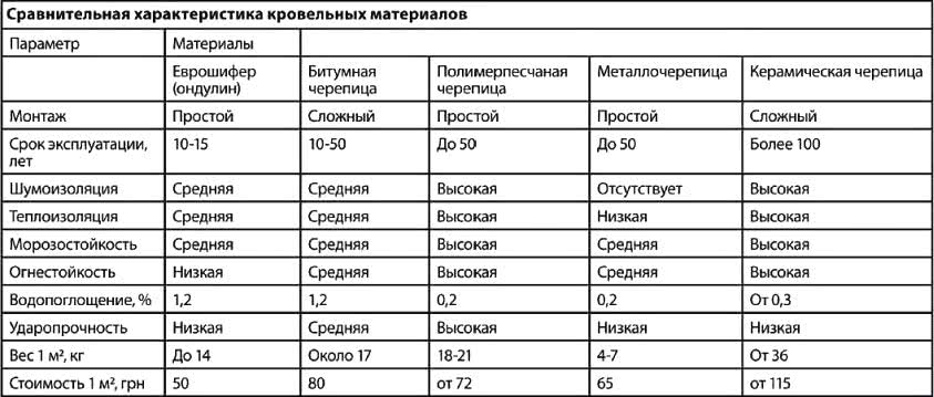 Таблица свойств кровельных материалов