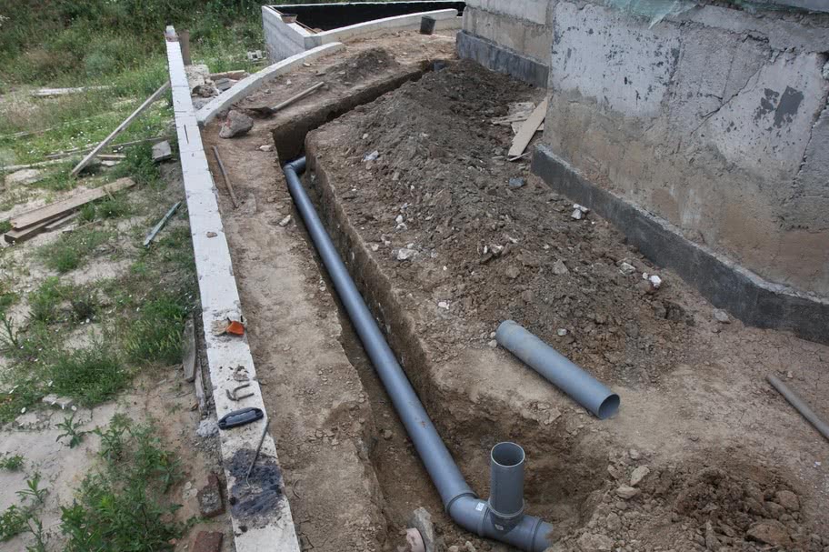 Тем, кто интересуется, как проложить канализационные трубы в земле правильно, следует учитывать, что работу необходимо начинать от фундамента здания. При отсутствии вывода трубопровода для стоков из дома, под основанием строения вырезают отверстие и выполняют подвод сети под него.